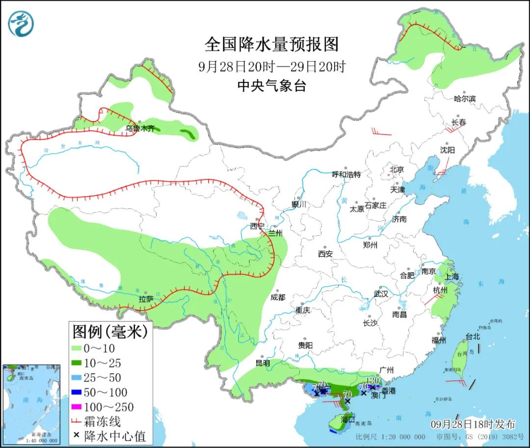 9月28日20时至29日20时,广西南部沿海、广东西南部沿海和海南岛等地部分地区有中到大雨,其中,广西南部、广东西南部、海南岛南部等地部分地区有暴雨或大暴雨。