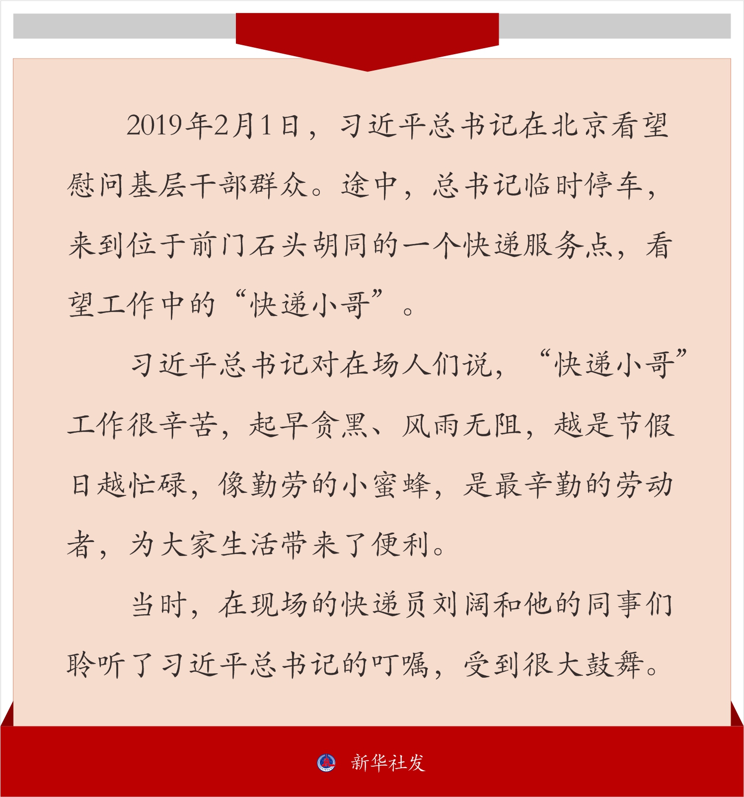 2019年2月1日,习近平总书记在北京看望慰问基层干部群众。途中,总书记临时停车,来到位于前门石头胡同的一个快递服务点,看望工作中的“快递小哥”。 习近平总书记对在场人们说,“快递小哥”工作很辛苦,起早贪黑、风雨无阻,越是节假日越忙碌,像勤劳的小蜜蜂,是最辛勤的劳动者,为大家生活带来了便利。 当时,在现场的快递员刘阔和他的同事们聆听了习近平总书记的叮嘱,受到很大鼓舞。 秋日的清晨,曙色微茫,凉风渐起。5:40的闹钟响起,刘阔麻利地起身、洗漱,骑上电动三轮车便出发了。 刘阔工作的快递分拣中心在北京市西城区陶然亭街道。卸车、消毒、扫描……一番操作熟练轻快,近千件的一车货,20分钟就卸完了。这一早,刘阔抬手弯腰的动作重复了数百次。 在北京市西城区陶然亭街道一处顺丰速运营业点,刘阔(左)和同事用传送带卸货并进行外包装消毒(2022年6月25日摄)。新华社记者 陈旭 摄 这个在河北农村长大的“85后”小伙子,个头不高,身材精瘦。五年前来北京打工,成为一名“快递小哥”。 常年日晒,刘阔的皮肤黑得发亮,经年累月搬重物,手掌和关节处布满老茧,右手大拇指指甲刻意留得又宽又长——刘阔说,这是为了能更快切断打包的胶带。 三年多前的春节前夕,在前门石头胡同快递服务点紧张工作的刘阔,收到了一份特殊的鼓励。 “当时我刚装完车,正在考察的习近平总书记来看望我们。总书记一把握住了我满是灰尘的手,温暖又有力。”回忆起当时的场景,刘阔说。 “这几年,我一直牢记着总书记的话,努力做一只勤劳的小蜜蜂。”从那以后,刘阔更加努力工作,奔跑在服务百姓生活的“最后一公里”。 在北京市西城区陶然亭街道一处顺丰速运营业点,刘阔整理刚卸下的大件货物(2022年6月25日摄)。新华社记者 陈旭 摄 住在厂甸小区的独居老人骆秀彩是刘阔的一位“特殊”客户。因腿脚不便,耄耋之年的骆奶奶几乎从不下楼,家里吃的用的,主要靠快递员投送。帮忙买药、丢垃圾、解答网购疑难……平日里,刘阔“顺手”帮老人做着一件件“小事”;“601开门慢,需等十分钟”,随身揣着的小本上,刘阔还歪歪扭扭地记下老人特点,做到周到服务。 渐渐地,在骆奶奶口中,“快递员小刘”变成了“阔儿”:“我生活中遇到问题,他从没二话,出力又出主意,像家人一样。” 用速度将快递运抵千家万户,用真诚服务温暖百姓心田。刘阔越来越感到,他这只“小蜜蜂”身上还有一份使命和责任。 快递还连着千城百业。2020年年初,新冠肺炎疫情突袭,琉璃厂东街的许多快递公司相继停运。作为京城售卖古玩字画的聚集地,街上百余家店铺的生意随着物流停摆而受到影响。 “幸亏刘阔他们还坚守着!”一家笔庄的老板感慨,“每月房租一万多,发不出去货,真急!小刘平安送出去的每一单,都连着我们小店的生计。” 三百多米长的琉璃厂东街上,人流熙熙攘攘,常听到街上居民或商户亲切地召唤着:“阔儿”“小蜜蜂儿”“快递小帅哥”……有人唤他进店歇歇脚,有人抓住他唠几句家常。 在北京市西城区琉璃厂东街,刘阔把快递送到客户手中(2022年6月25日摄)。新华社记者 陈旭 摄 疫情初期防疫物资紧缺,一位大姐给刘阔拿来一副医用手套和护目镜。“手上都是裂口还老徒手送快递,多危险啊!”大姐满脸担忧。刘阔的话很朴实:“国家有困难了,我能干一点儿是一点儿。” 2021年春节前夕,很多人选择就地过年,用寄送“亲情包裹”表达对家人的思念。一时间,快递订单“爆满”了。刘阔所在的服务点压力陡增:大大小小的包裹从分拣中心涌到门口台阶,再从小院溢到了马路边,工作量大增。 当时,刘阔组里只有6个人,因为疫情,有的人请假,有的人离职回老家。电话那头,媳妇忧心忡忡:“要不咱也回老家吧?全家都指着你呢。”“都想走,活儿谁干?国家还怎么运转?”一向好脾气的刘阔“倔”了起来。 那一刻,作为组长的刘阔咬紧了牙关:“一点点儿干,愚公移山地干,把缺岗兄弟的活儿干出来。” 在北京市西城区陶然亭街道一处顺丰速运营业点,刘阔(左)和同事一起将货物装车(2022年6月25日摄)。新华社记者 陈旭 摄 此后连续17天,刘阔像陀螺一样运转。每天凌晨5点半,他第一个到达分拣中心,用贴满创可贴的双手把一批批货物分拣、派送出去;晚上10点,他又拖着疲惫的身体回到服务点,继续给新收的快递打包,直到深夜;一天里,爬楼近百次、接打电话百余个,客户催件发火,他就用脖子夹着发烫的手机礼貌回应,手里还不停地忙着活计……有一次,在正月的寒风中,刘阔累得竟靠在车上睡着了。 一位客户收到盼了多天的药品快递,激动地端来一盘热气腾腾的饺子,邀请这位“勤劳的小蜜蜂”一起过年。 2021年6月5日,刘阔光荣地加入了中国共产党。他说,习近平总书记一心为民。见到总书记那天起,我就要求自己也要有一颗为人民服务的真心。我申请入党,就是为了更好地为群众服务。2019年10月,他郑重递交了入党申请书…… 2022年北京冬奥会举世关注。开幕式上,一面鲜艳的五星红旗在100多位各民族、各行业群众代表手中传递。身着红黑灰相间工作服的刘阔,作为400多万“快递小哥”的代表,参与并见证这一激动人心的时刻。 当晚,他用粗糙的手指一笔一画在手机朋友圈深情写下:清澈的爱,只为中国。 “我曾经跨过山和大海,也穿过人山人海……直到看见平凡才是唯一的答