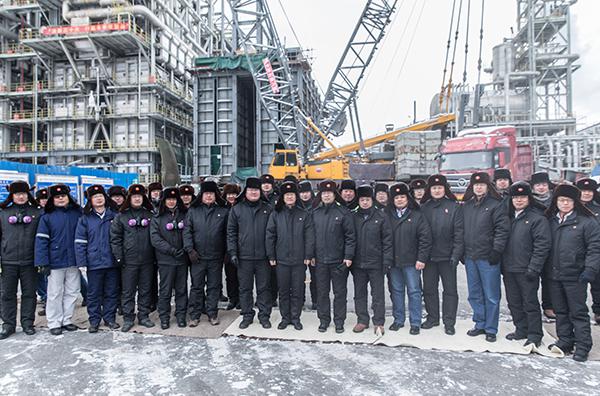 在9号裂解炉施工现场,任立新代表公司向施工单位表示感谢,祝大家新年快乐、身体健康,希望所有参战人员关注施工质量,以安全为重,做好冬季保暖和个人防护,让单位放心,也让家人放心。随后,领导一行与中油六建现场人员合影留念(见下图,记者 于文亮 摄)。