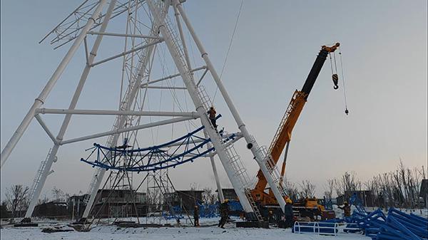 据独山子天鼎投资集团有限责任公司独库自驾车营地项目负责人姜华介绍,摩天轮项目从今年6月份开始筹备,10月中旬开始现场组装,目前整个摩天轮的建设已经进入外圆安装阶段。