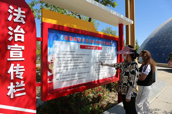 公园门前广场和公园内随处可见法治宣传语和法律条文、法治格言宣传展板,展板以图文并茂的形式宣传家庭关系、民间借贷、房屋买卖、交通事故、夫妻债务、个人信息保护、未成年人保护法等法律知识,内容通俗易懂,吸引了众多市民驻足观看。市民李先生说:“我和家人休闲时喜欢在公园里散散步,散步时会看一看宣传展板内容,这样的法治宣传方式挺好。”