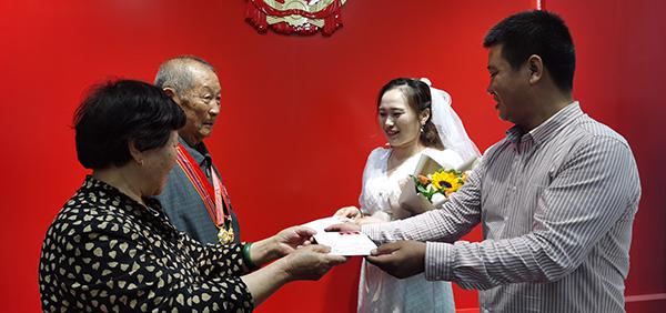 为了增强仪式感,区民政局还邀请了金婚夫妇、“最美家庭”代表为新人颁发结婚证。李如彬、莴永琼这对金婚老人为了给新人颁证,专门打扮了一番。李如彬老人特意戴上了“中国人民志愿军抗美援朝出国作战70周年”“光荣在党50年”的勋章。两位老人郑重地把结婚证颁发给王小强、李洪玉,祝福他们新婚快乐、百年好合。 李洪玉说:“金婚老人为我们颁发结婚证非常有意义,终生难忘。我希望我们也能像他们一样携手走向金婚。”2020年度自治区“最美家庭”荣誉获得者杜彪、雷芳东夫妇为新娘披上头纱,祝福小两口的日子甜甜蜜蜜。 领证对于每对新人来说都是神圣、幸福的。达尼亚尔为了这一天提前做了不少准备,不仅买了一大束红色玫瑰,还准备了头纱、戒指,现场向新娘迪拉热求婚。达尼亚尔说:“今天是个好日子,是个好开始,我希望从今以后我们的生活甜蜜幸福。” 为倡导移风易俗,区民政局提前发布婚姻倡议书,倡导居民自觉做到婚事新办喜事简办,抵制高额彩礼、滥发请柬、大摆宴席、铺张浪费等不良现象,提倡新人以参加公益活动、文明旅游等方式举行婚礼,做践行文明新风的带头人。