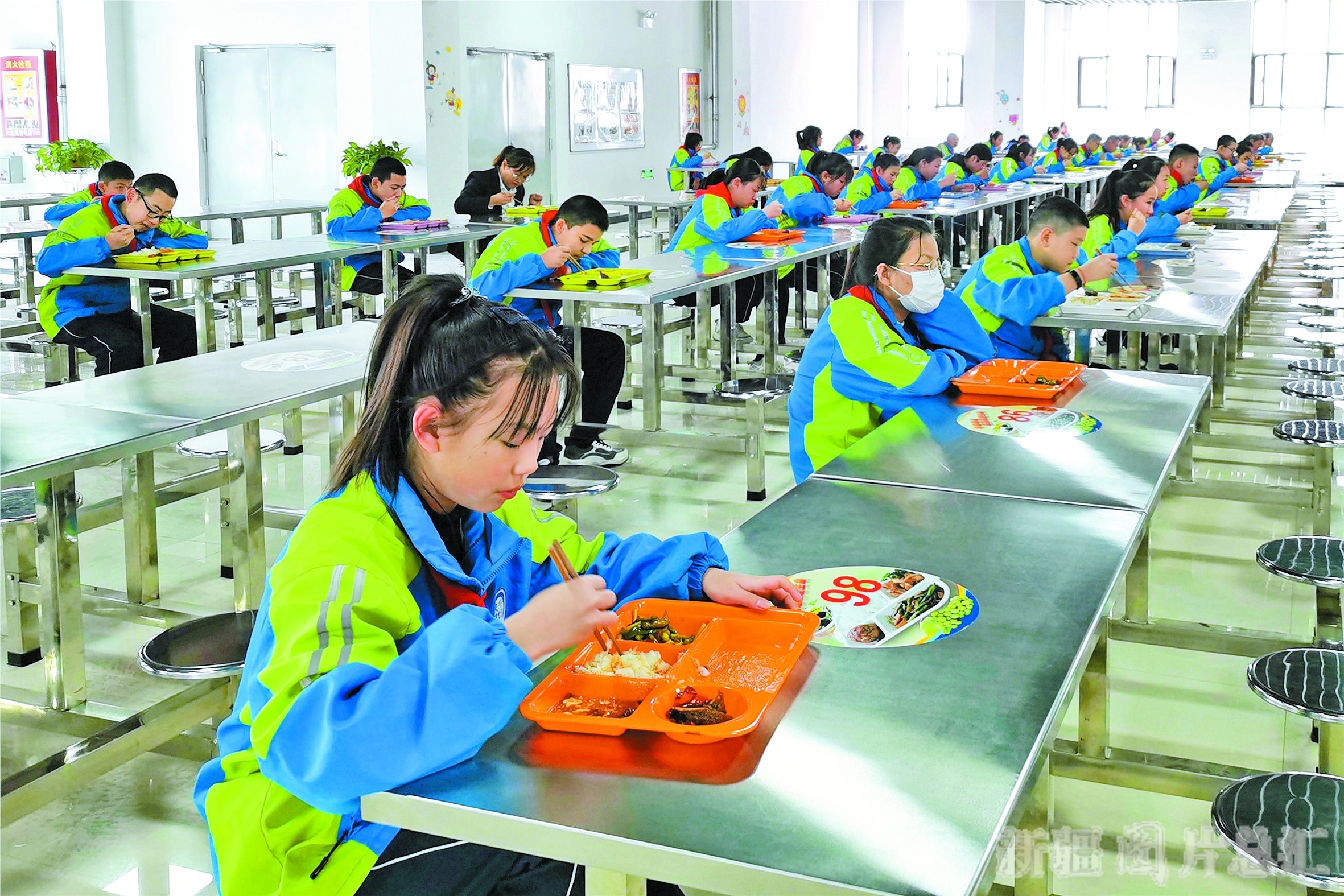 3月23日,阿克苏市天杭实验学校,学生实行错位就餐。□杨硕摄