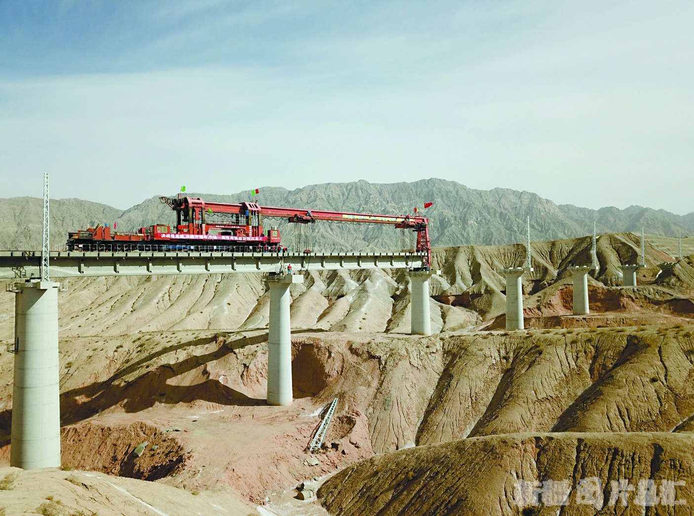 3月21日,中铁一局格库铁路新疆段架桥机正在骆驼泉2号特大桥进行架梁作业。当日,格库铁路新疆段铺轨工程全面复工。□陈剑飞摄