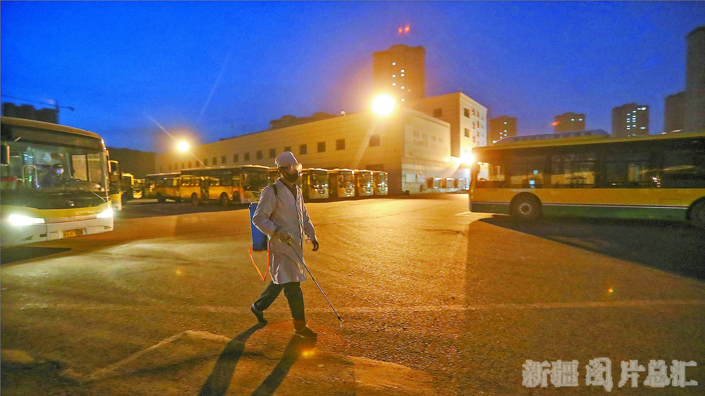 4月18日7时,乌鲁木齐市公交集团经营三部23车队专职防疫员赵强在停车场对公交车进行消毒作业。