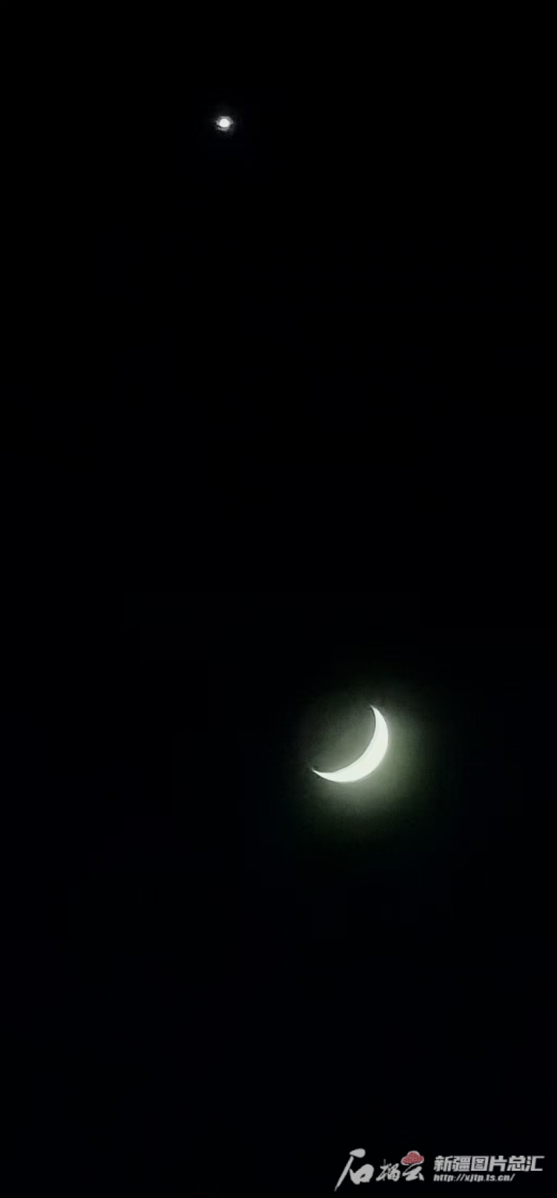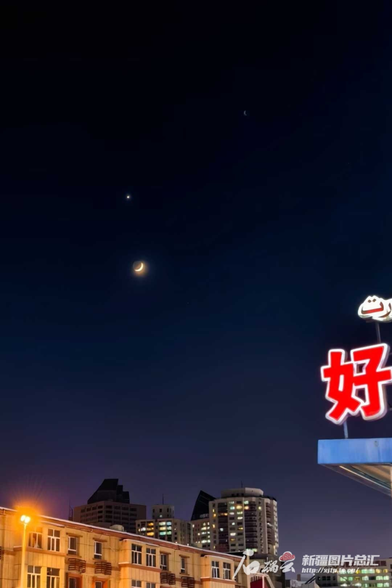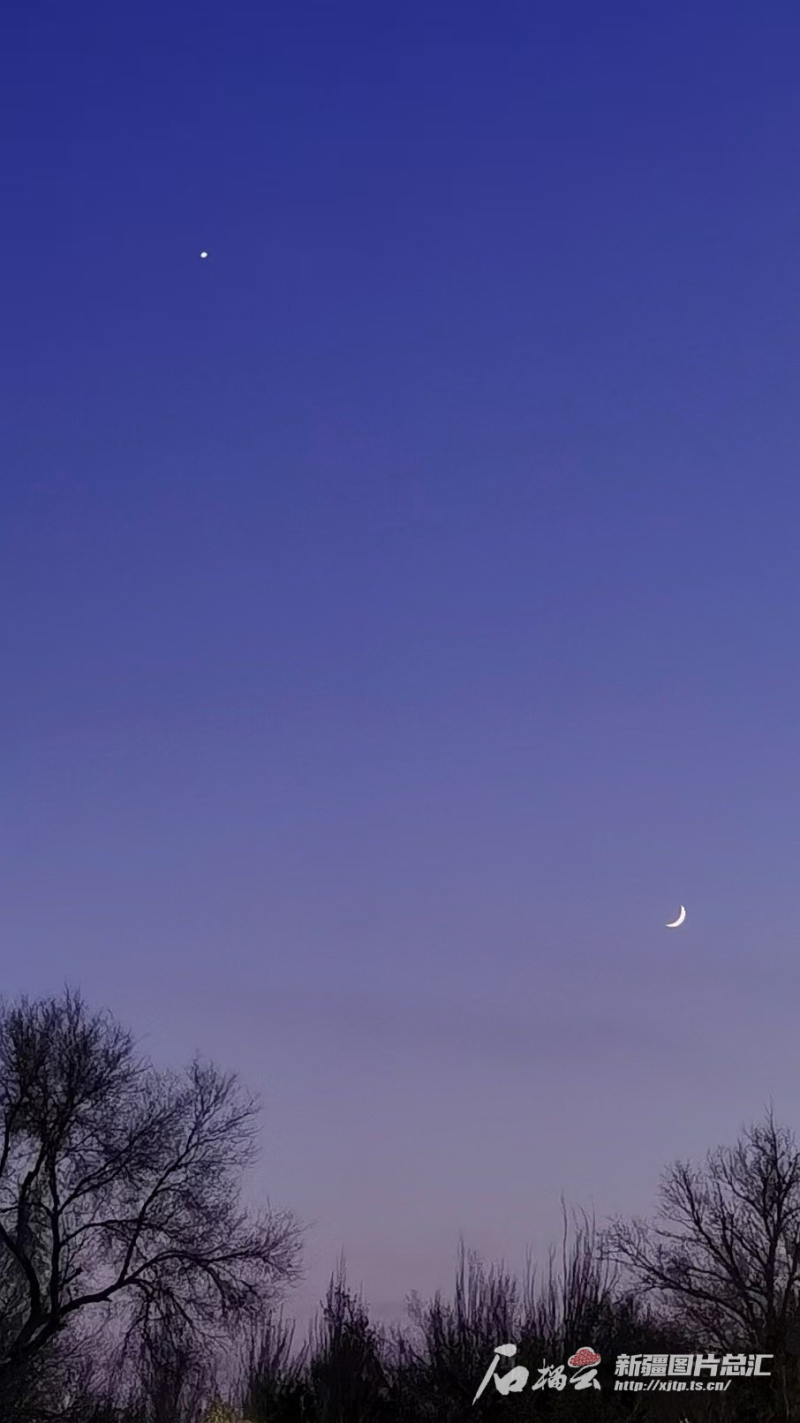 新年首月的“星空舞台”让人眼前一亮。1月3日晚,金星伴月亮相新疆夜空,亮如明珠的金星将与一弯蛾眉月在天空近距离相伴,为公众带来一场既好看又容易观测到的“星月童话”。在天气晴好的地方,放学路上、下班路上……新疆网友们肉眼就能看到夜空里上演的这一幕美丽的画面。 金星如灯月如钩,一起来欣赏这份美景,传递好运!