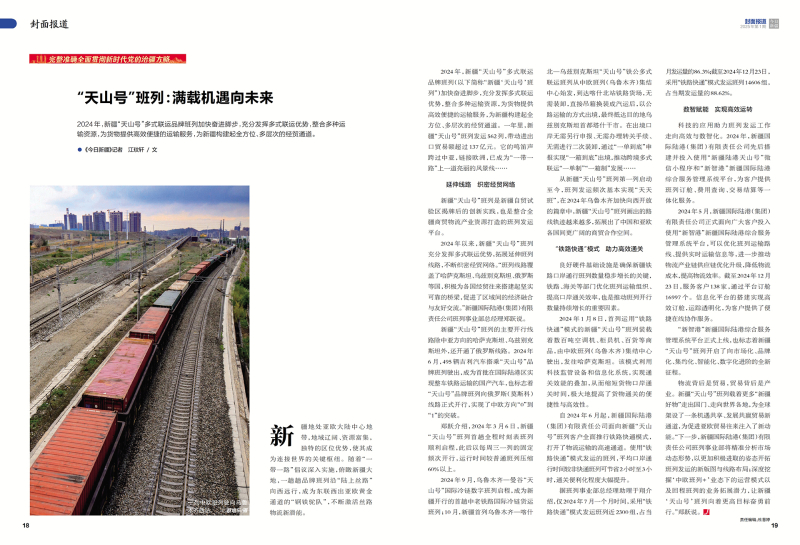 2024年,新疆“天山号”多式联运品牌班列加快奋进脚步,充分发挥多式联运优势,整合多种运输资源,为货物提供高效便捷的运输服务,为新疆构建起全方位、多层次的经贸通道。 ● 《今日新疆》记者 江玟轩 / 文 新疆地处亚欧大陆中心地带,地域辽阔、资源富集,独特的区位优势,使其成为连接世界的关键枢纽。随着“一带一路”倡议深入实施,俯瞰新疆大地,一趟趟品牌班列沿“陆上丝路”向西远行,成为东联西出亚欧黄金通道的“钢铁驼队”,不断激活丝路物流新潜能。