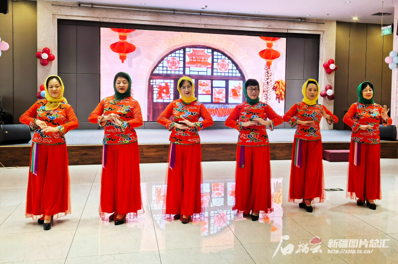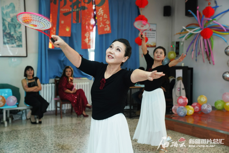1月11日,乌鲁木齐市沙依巴克区雅玛里克山街道南梁坡社区组织的群众村晚现场,居民在表演舞蹈《我爱柔力球》。石榴云/新疆日报记者 张万德摄