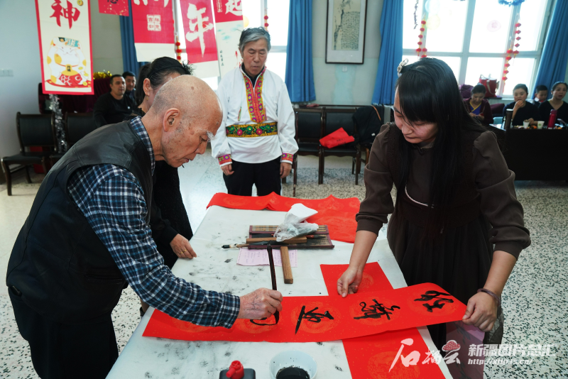 1月11日,乌鲁木齐市沙依巴克区雅玛里克山街道南梁坡社区组织的群众村晚现场,书法达人现场为居民写春联和福字。石榴云/新疆日报记者 张万德摄