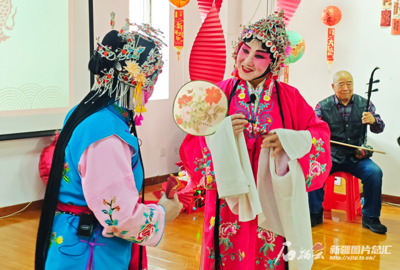 1月10日,乌鲁木齐经济技术开发区(头屯河区)王家沟街道百园社区联合区城管局、建设局工作队举办村晚,居民在表演传统戏剧。徐玮摄