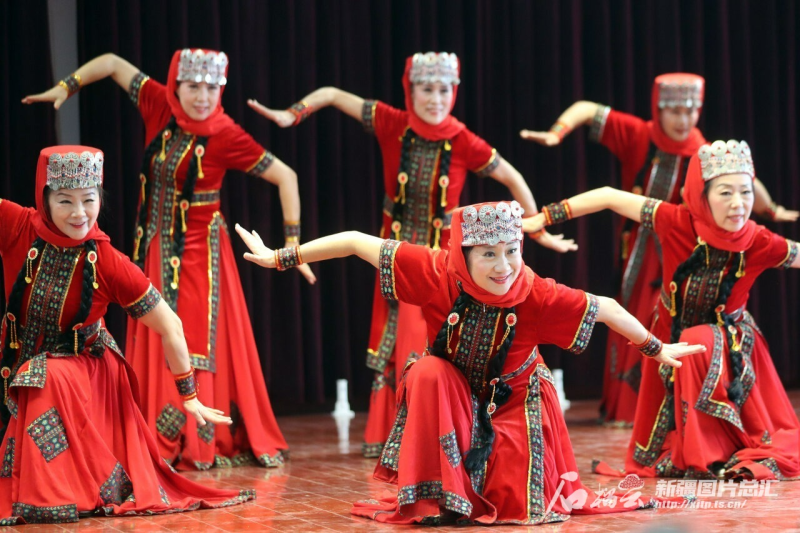 1月7日,乌鲁木齐市水磨沟区南湖南路街道南湖南路西社区与绿苑社区、劳动街社区、南湖广场社区共同举办“我们的村晚”社区文艺汇演,居民在表演舞蹈《飞翔的鹰》。石榴云/新疆日报记者 李雄心摄