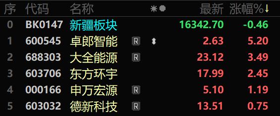 新疆板块指数近十日变化趋势(来自东方财富)。 二、股价涨幅排名: 当日,新疆板块股价涨幅排名前5的股票分别为:卓郎智能(600545)收盘价2.63元,涨幅5.20%;大全能源(688303)收盘价23.12元,涨幅3.49%;东方环宇(603706)收盘价17.99元,涨幅2.45%;申万宏源(000166)收盘价5.10元,涨幅1.19%;德新科技(603032)收盘价13.51元,涨幅0.75%。