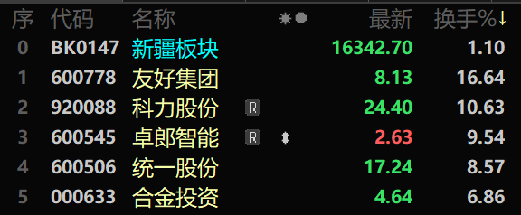 1月15日新疆板块股价涨幅排名(来自东方财富)。 三、换手率排名: 当日,新疆板块换手率排名前5的股票分别为:友好集团(600778)16.64%、科力股份(920088)10.63%、卓郎智能(600545)9.54%、统一股份(600506)8.57%、合金投资(000633)6.86%。