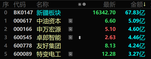 1月15日新疆板块换手率排名(来自东方财富)。 四、成交金额排名: 当日,新疆板块成交金额排名前5的股票分别为:中油资本(000617)5.09亿元、申万宏源(000166)4.60亿元、卓郎智能(600545)4.46亿元、友好集团(600778)4.24亿元、特变电工(600089)3.27亿元。