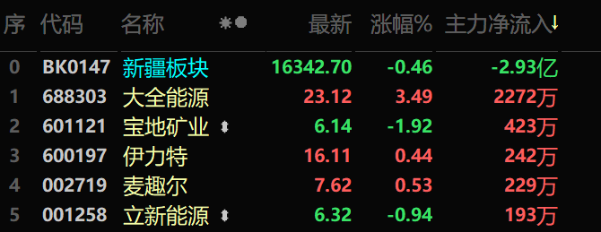 1月15日新疆板块成交金额排名(来自东方财富)。 五、主力资金流向: 当日,新疆板块主力资金净流入排名前5的股票分别为:大全能源(688303)2272万元、宝地矿业(601121)423万元、伊力特(600197)242万元、麦趣尔(002719)229万元、立新能源(001258)193万元。