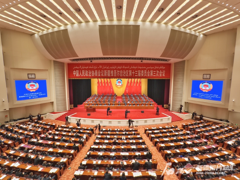 1月18日,中国人民政治协商会议新疆维吾尔自治区第十三届委员会第三次会议在新疆人民会堂开幕。石榴云/新疆日报记者 崔志坚摄 石榴云/新疆日报讯(记者 张艳芳 李杨报道)1月18日上午,自治区政协十三届三次会议在新疆人民会堂开幕。 马兴瑞、司马义·铁力瓦尔地、艾尔肯·吐尼亚孜、祖木热提·吾布力、肖开提·依明、艾斯海提·克里木拜、何忠友、张柱、陈明国、杨诚、田湘利、陈伟俊、王建新、玉苏甫江·麦麦提、伊力扎提·艾合买提江、哈丹·卡宾在主席台就座,祝贺大会召开。 自治区政协主席努尔兰·阿不都满金,副主席吉尔拉·衣沙木丁、孔星隆、杨勇、阿不都热克甫·吐木尼牙孜、努热木·斯玛依汗、艾则孜·木沙、刘会军、刘见明、蒲雪梅、许咸宜、艾山江·艾合买提、金之镇、巴图,秘书长高江淮在主席台前排就座。 努尔兰·阿不都满金代表自治区政协十三届常委会,向大会报告工作。部分外国驻华使节及国际组织代表、海外侨胞、驻京外媒及港澳媒体记者等应邀参加开幕会。