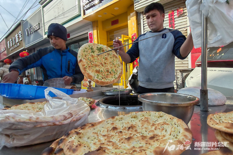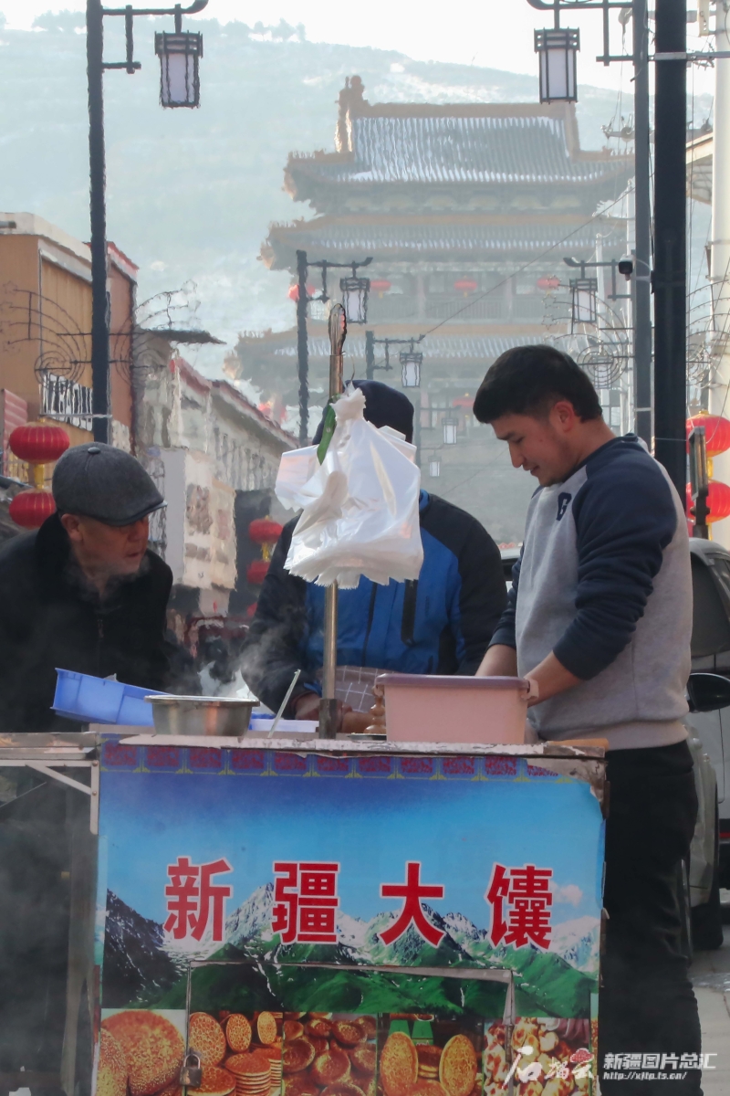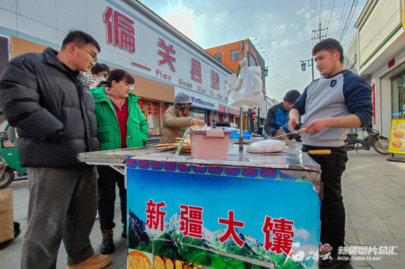 2月4日,喀什小伙吐尔逊艾力·玉奴斯(右一)在偏关县古城街头烤制馕饼。 石榴云/新疆日报讯(记者 蔡增乐摄影报道)“新疆馕饼,一个4元,十元3个。”2月4日,偏关县古城街头,新疆喀什小伙吐尔逊艾力·玉奴斯一边吆喝一边烤制馕饼。 正月初七一大早,租住在山西省忻州市偏关县古城大街的吐尔逊艾力和表弟牙尔买买提·库尔班早早地来到古城街头,开始了一天的烤馕生意。 古城大街上人来人往熙熙攘攘,不时有人驻足观看烤馕过程,还没开摊,当地居民王美芸就扫码订了10个烤馕。“昨天买了几个觉得挺好吃,今天要回乡下,买上些让家人也尝尝。”王美芸说。 今年25岁的吐尔逊艾力来自新疆喀什地区伽师县克孜勒博依镇博提玛村,去年经人介绍来到偏关古城大街卖烤馕。 “生意还不错,白天能卖600多元的馕饼,晚上还能卖500多元的烤肉。”吐尔逊艾力说,让新疆美食香飘整个偏关古城。 从喀什古城到偏关古城,新疆馕香飘7200里,浓郁的新疆味在吸引食客的同时也成为了当地独特一景。