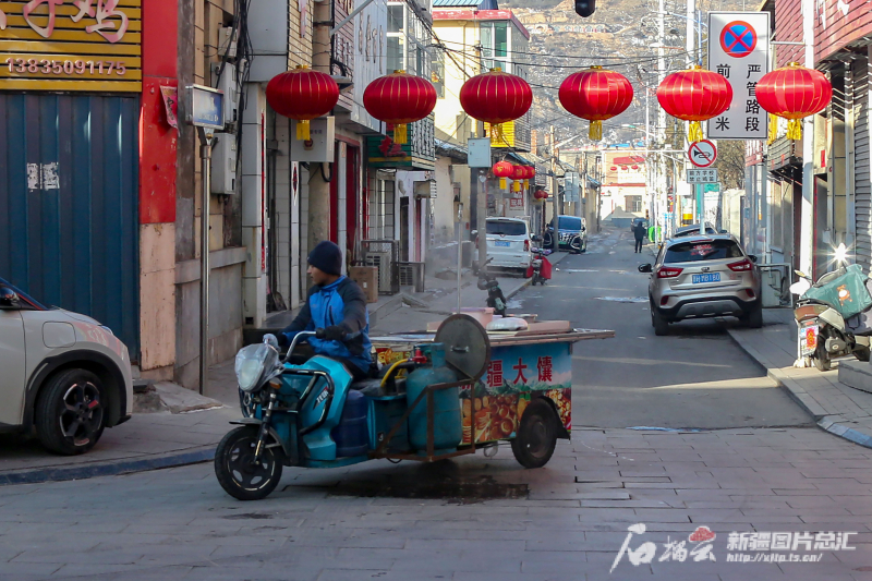 2月4日,喀什小伙牙尔买买提·库尔班骑着流动馕坑车行驶在偏关县古城大街上。