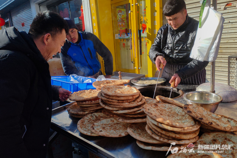 顾客在吐尔逊艾力的馕摊上购买新疆烤馕。