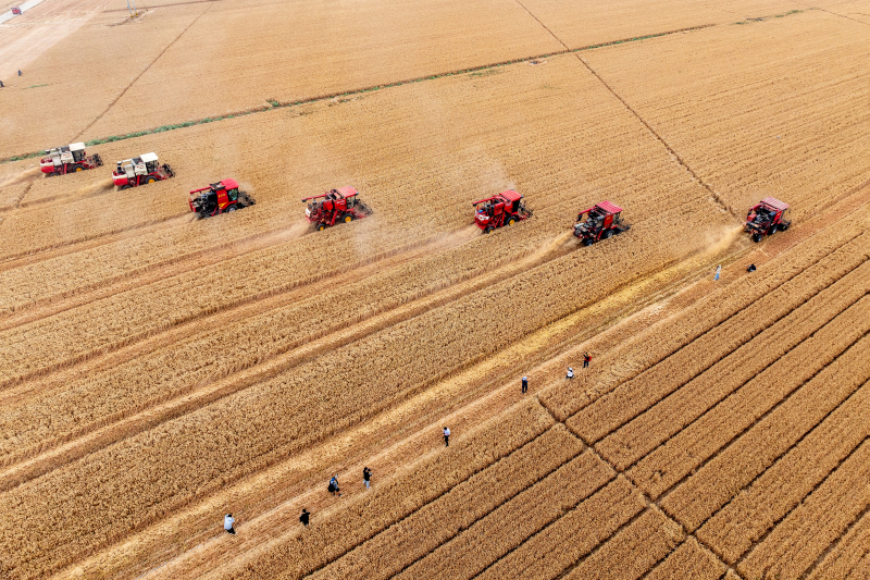 2024年6月,河南滑县小铺富强种植农民专业合作社麦田里,小麦机收减损技能大比武活动紧张进行。王子瑞摄 2024年,河南粮食总产量1343.9亿斤,连续8年稳定在1300亿斤以上。以全国十七分之一的耕地,生产了全国近十分之一的粮食、超过四分之一的小麦,中原粮仓河南名副其实。 太康县所在的豫东平原,是河南粮食的主要产区之一。陈国厂的骄傲,就在于此:保障国家粮食安全,汪庄村有贡献。 如果从高空俯瞰,汪庄村的1800亩麦田,就像铺设在沃土上的绿色地毯,整齐划一。全村土地采取整体经营的模式,耕种管收售实现五统一。“这是进一步提升粮食产量的关键。”陈国厂说,土地散、小块田是制约粮食生产提质增效的主要问题之一,统一经营后,效率更高、效果更好地农用机械可以发挥作用,优良品种可以大面积推广,还可以降低种肥药等农资成本。 统一经营,村集体“大办”农业的模式下,管理效率也得到进一步提升,汪庄村成立集体合作社之外,还将7个村民小组分别成立家庭农场,选择适合的村民当家,管好农田。 种植潜力和管理效能的双重释放,带来了粮食产量的进一步提升。汪庄村在粮食生产上的一系列变革,正是河南粮油作物大面积单产提升行动的一个缩影。