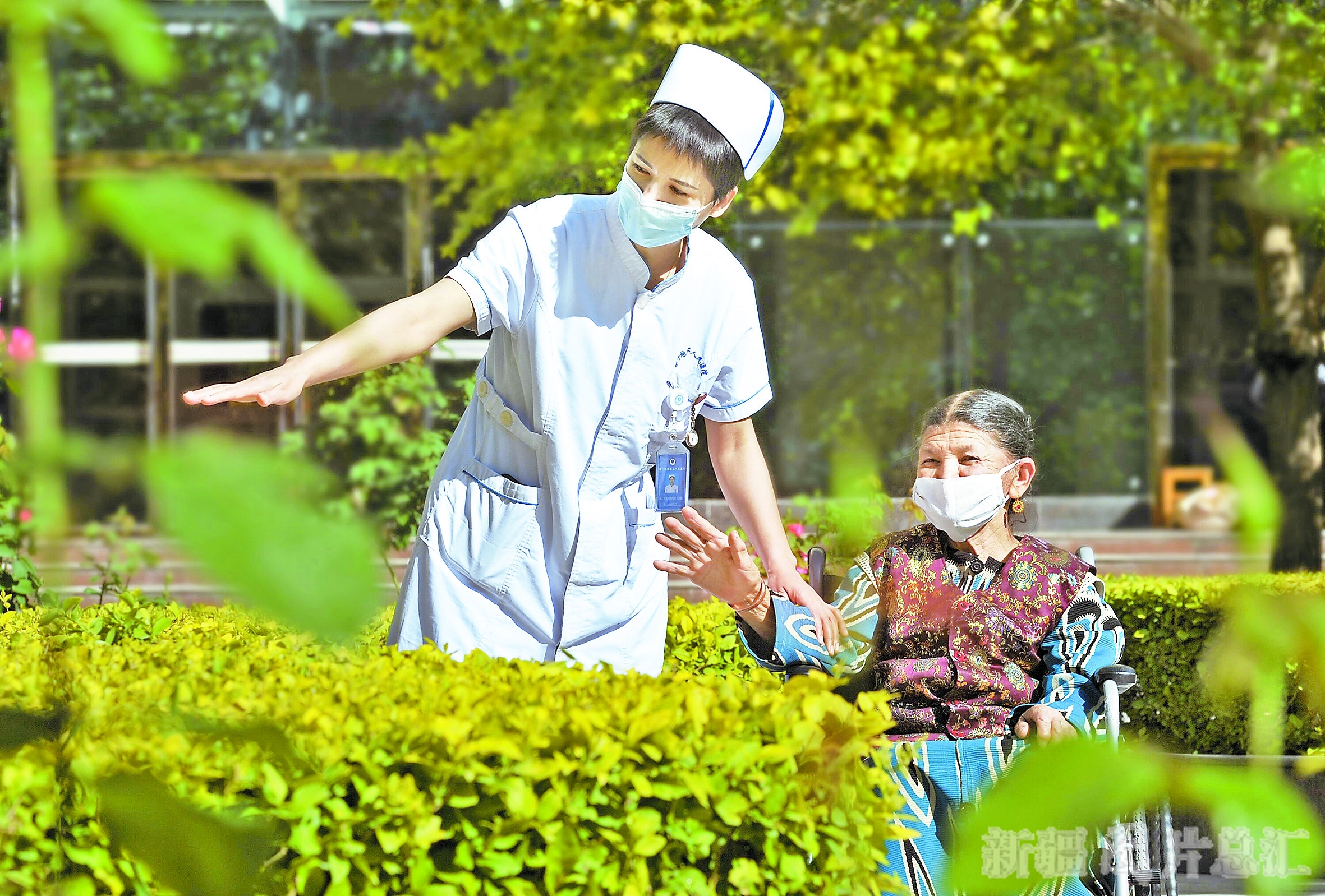 5月10日,喀什地区第二人民医院呼吸科护士、援鄂医疗队成员阿依加玛丽·买买提带患者到户外活动。□本报全媒体记者约提克尔·尼加提摄