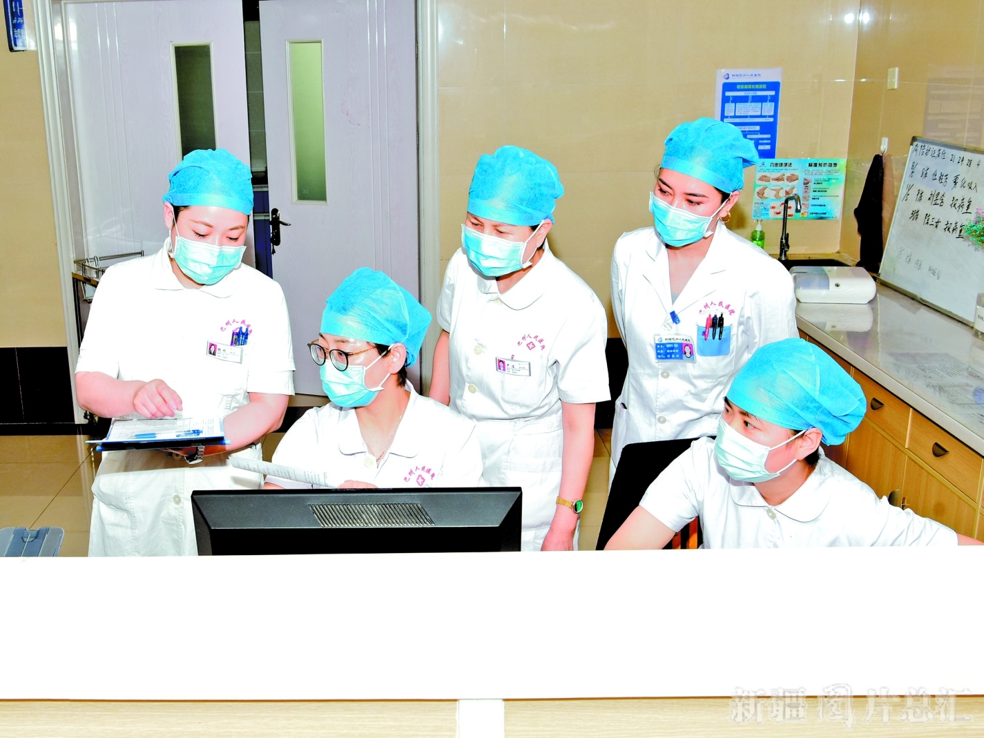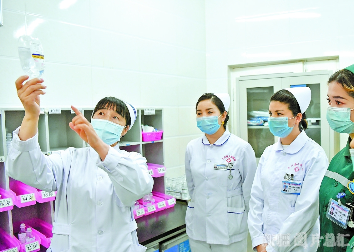 5月11日,于田县人民医院护理部主任布仁巴依(左一)在给护士传授护理经验。 □本报全媒体记者周鹏摄