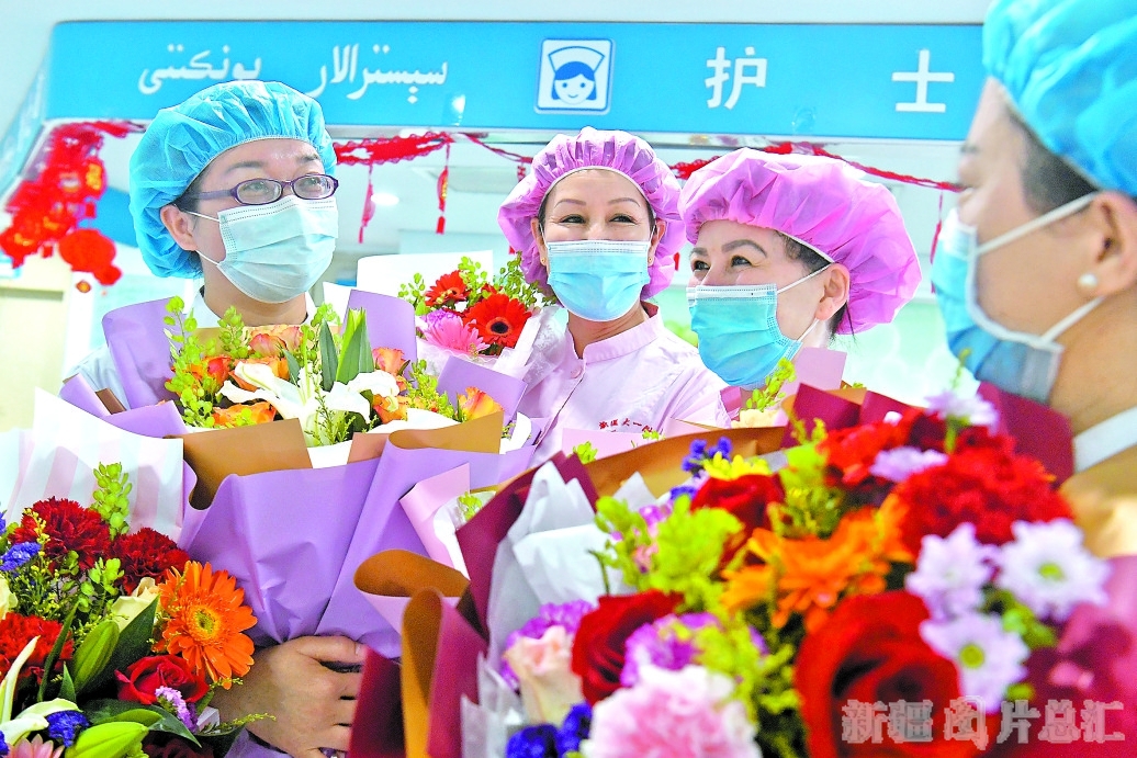 5月9日,新疆医科大学第一附属医院护士相互祝福节日。□本报全媒体记者韩亮摄