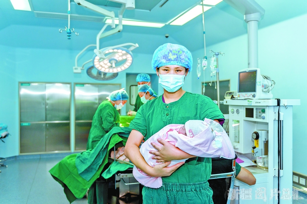 5月10日,在伊犁哈萨克自治州新华医院手术室,产房助产护士田珊怀抱新生儿。 □孙艺男摄