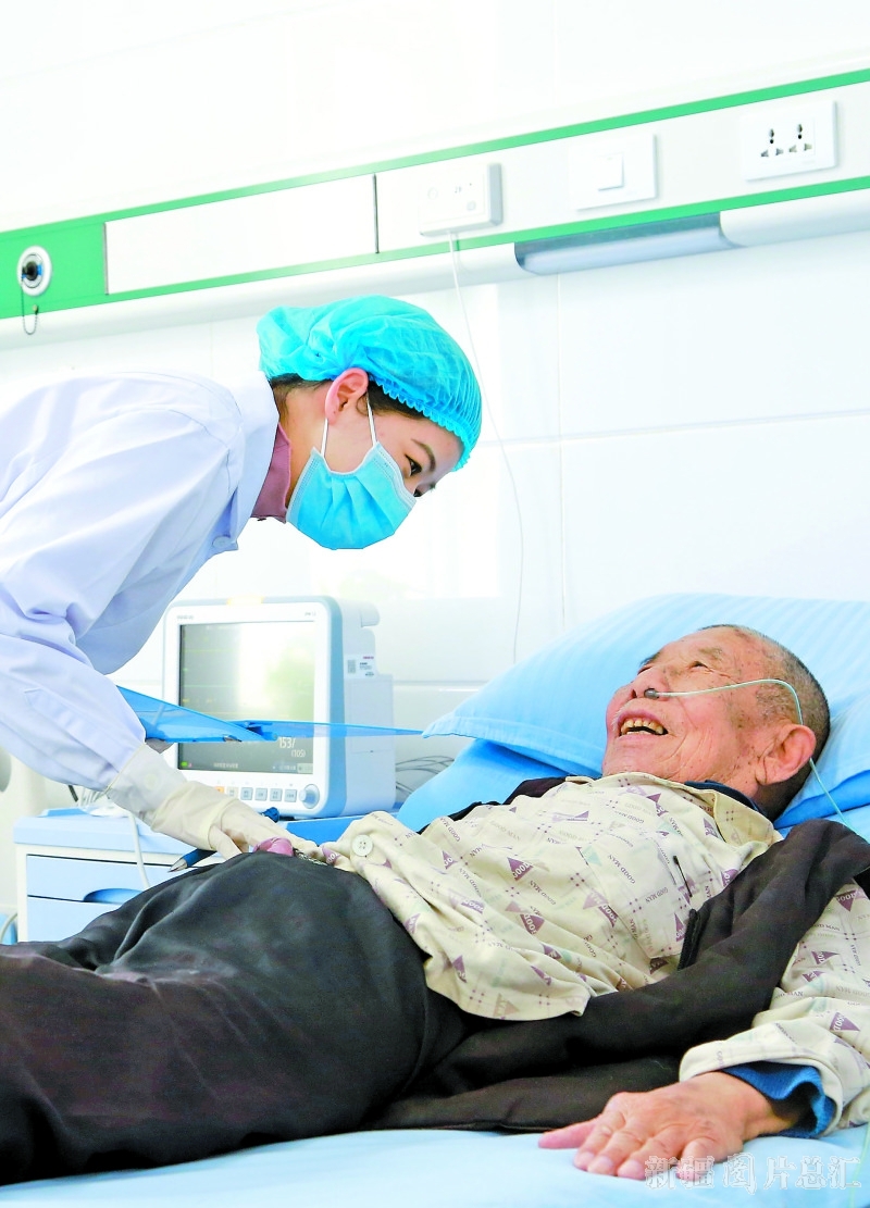 5月11日,在精河县托里镇卫生院急诊室病房内,护士杨凤洁正在询问患者情况。 □赛永杰摄
