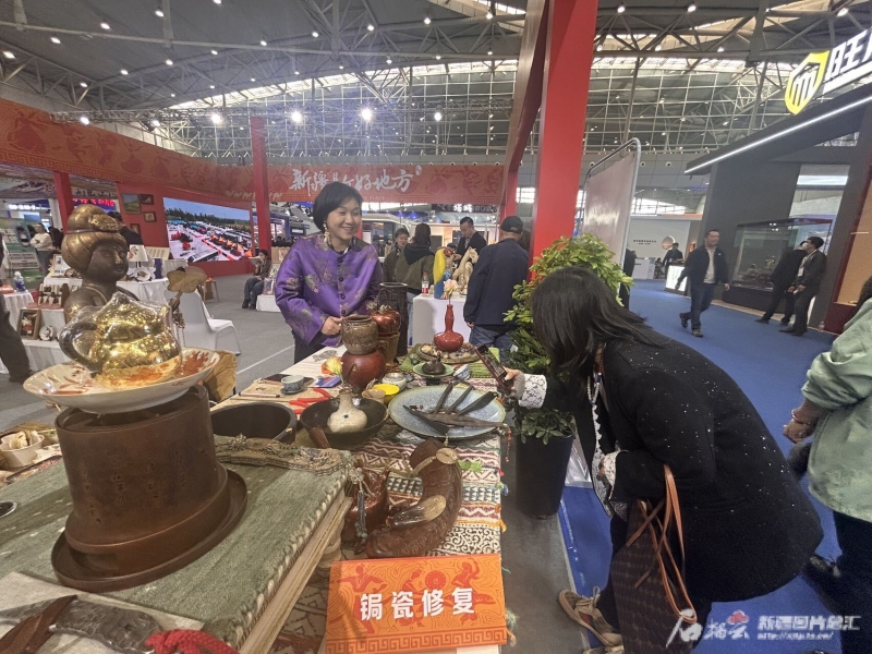 怀元辰给小观众介绍面塑作品。石榴云/新疆日报 记者张小宓摄 有人想要购买骆驼当给游客的伴手礼,也有景区邀请怀元辰去景区开工作室,现场制作面塑。“手机上添加了很多人,等展会后细细梳理再沟通。通过展会,让更多人了解到这项非遗,非常高兴。也希望通过游客,将它们带到全国各地。” “没有金刚钻,别揽瓷器活,说的就是锔瓷这门古老的手艺。 ”锔瓷修复项目非遗代表性传承人颜鹏力,指着展台上的作品,给大家介绍着“金银铜铁石木角”几大类锔瓷修复的作品。“很期待和景区景点的合作,通过研学体验,让更多人了解到锔瓷修复这项工艺。”