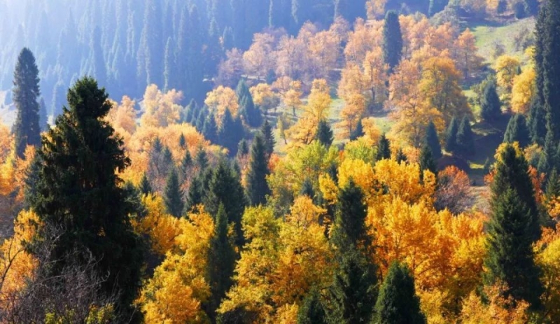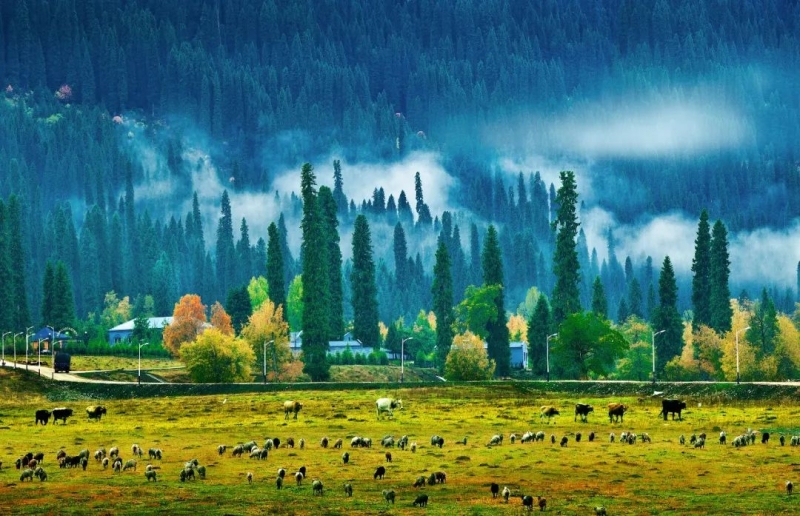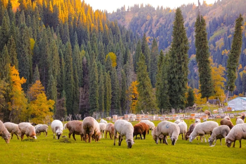 远处有高低起伏连绵不断的山峦,时而叠嶂起伏,时而舒缓柔美。分不清是特克斯河、巩乃斯河,还是伊犁河的支脉穿行在旷野中,不时有明镜般的河面像时间的印记若隐若现,在远方发光。 新疆北方秋季风干物燥,大多数地方,特别是旷野,一般此刻都已遍布枯朽的沉沉暮气,而通往巩留的这一路上却是清新明净的画面。不禁让人有胸襟开阔、血液沸腾之感。醺醺然,也忽然共情了唐代诗人刘禹锡借秋抒怀的那句“晴空一鹤排云上,便引诗情到碧霄”。 巩留,哈萨克语为“托古斯塔绕”(意为九条支流),其境内丰沛的河流资源在全疆县市中榜上有名。巩留是被厚爱的,它的湿润在新疆这个离大海最遥远的境域内是罕见的。