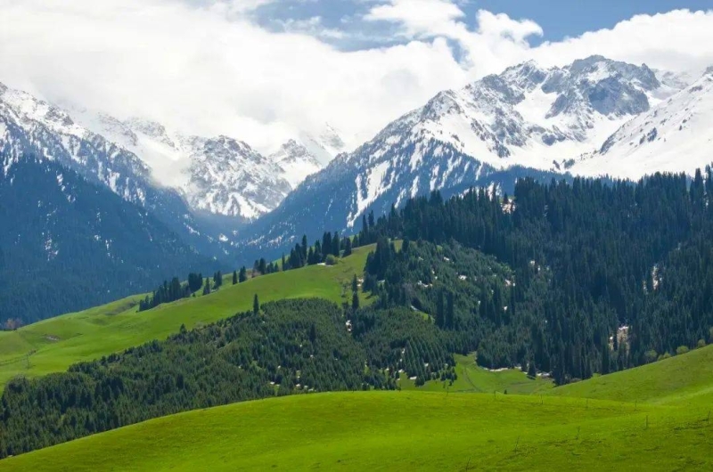 品读新疆 远处有高低起伏连绵不断的山峦 时而叠嶂起伏,时而舒缓柔美 分不清是特克斯河、巩乃斯河 还是伊犁河的支脉穿行在旷野中 不时有明镜般的河面像时间的印记若隐若现 在远方发光