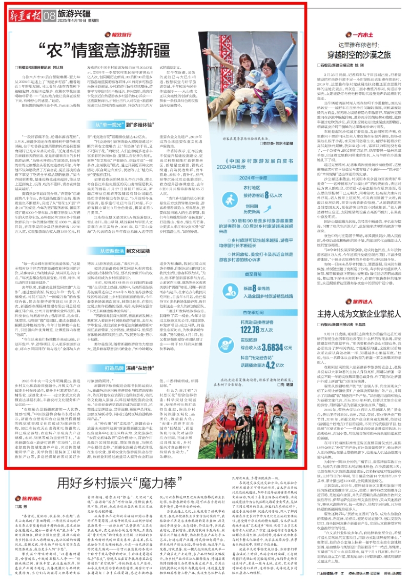 游客在夏季草场体验牧民生活。努尔曼·努尔卡勒摄 “通过开发转场旅游业态,我赚到了第一桶金。今年计划成立旅游文化公司,组建团队开发新项目;成立马队,打造原生态家访点,为秋季转场作准备。”努尔曼说。4月1日,他又收到摄影爱好者团队预订金——将于10月前来拍摄秋季转场。 打造品牌深耕“在地性” 2025年中央一号文件明确提出,推进乡村文化和旅游深度融合,开展文化产业赋能乡村振兴试点,提升乡村旅游特色化、精品化、规范化水平……建立优质文化资源直达基层机制,丰富农村文化服务和产品供给…… “农旅融合是新疆旅游的一大优势,前景可期。”中国旅游协会秘书长葛磊表示,新疆农业景观和农业设施凭借震撼的视觉效果和文化底蕴成为旅游吸引物,如江布拉克天山麦海和吐鲁番坎儿井已成必游地;农业特产形成庞大产业规模,水果、坚果等成为重要伴手礼。“未来新疆农业+旅游可深耕‘在地性’,以农业健康价值赋能康养产业,劳动价值赋能研学产业,美学价值(服装加工)赋能旅拍产业等,多途径满足游客对美好乡村旅游的期待。” 新疆研学旅游促进会秘书长陈运良认为,新疆各地正积极推进农业与旅游深度融合,依托特色农业资源打造独特景观,将民俗文化融入旅游,以科技赋能设施农业观光。“未来农业研学旅游应成为重要方向,还需通过品牌建设、完善设施、拓展产品开发、加强区域联动等,共同打造跨区域旅游线路和产品。” 从“种农田”到“卖风景”,新疆农业+旅游未来如何发展?新旅投新疆文旅产业投资服务中心主任朱峰认为,文化旅游在“农商文旅体教养”综合格局中,首要作用是提升区域知名度、增加客流量,为相关产业提供支持。“新疆农旅融合模式体现在生态农业、景观农业为旅游提供业态资源,旅游业则通过流量导入提升农业附加值。二者相辅相成,相得益彰。” 他认为浙江省“万村景区化”经验值得借鉴:科学规划全域蓝图,发挥各村优势打造特色业态,推动乡村休闲旅游区域化、品质化、效益最大化。“农业+旅游不应是城市‘低配版’,而是传统与现代对话的活力空间。当城乡形成良性互动,乡村振兴才真正拥有可持续内生动力。”朱峰说。