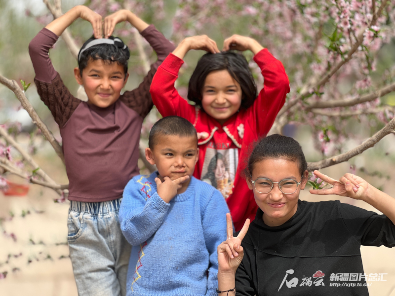 4月15日,喀什地区伽师县居仁镇仓村的小朋友们收到来自首都北京的爱心礼物后“比心”感谢。石榴云/新疆日报记者 唐堪东摄 记者了解到,自2019年以来,经济日报社妇委会已多次向南疆小朋友捐赠妇女干部职工手工编织的“特殊礼物”。
