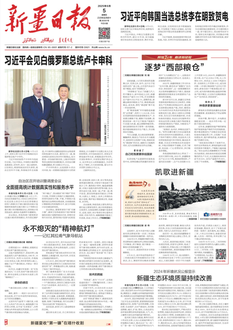 石榴云/新疆日报记者 刘毅 说到新疆,人们首先想到的是歌舞之乡、瓜果之乡。如今,这片位于祖国西北的广袤土地,正在现代农业引领下崛起,成为“西部粮仓”。 “西部粮仓”见证了新疆几代人的不懈奋斗。新中国成立之初,新疆粮食总产量为110万吨,在全国粮食总产量中占比不足1%。更难的是,新疆远离国内粮食主产区,粮食调运距离远、成本高,想吃“调进粮”都不是一件容易的事。 将“粮食饭碗”牢牢端稳是新疆的“必答题”。党的十八大以来,自治区党委和政府高度重视粮食生产,全面落实藏粮于地、藏粮于技战略,抢抓国家新一轮千亿斤粮食产能提升行动重大机遇,通过调整种植结构、强化政策和技术引领等一系列措施,稳步提高粮食综合生产能力,夯实粮食安全基础。 今日之新疆,天山南北硕果累累、穰穰满家。粮食生产综合水平大幅提升,连续多年实现增产丰收,彻底结束吃“调进粮”的历史,端稳自己饭碗的同时,还为全国粮食安全作出贡献。 责任重了 自己吃饱更要供给国家 优质农牧产品重要供给基地是党中央、国务院确定的新疆在国家全局中“五大战略定位”之一,这既是对新疆农业发展实力的认可,也是肩上沉甸甸的责任。 2022年,新疆将粮食工作方针由“区内平衡、略有结余”调整为“区内结余、供给国家”。这一政策调整旨在充分发挥新疆粮食生产潜力,提高新疆保障国家粮食安全和重要农产品供给的贡献度。 新方针实行以来,新疆压实各级党委和政府粮食安全主体责任,将粮食生产任务落实到地县乡村,通过落实面积稳定粮食产能。同时,继续加大中央和自治区各类涉农财政资金统筹支持力度,落实小麦和大豆种植补贴,优先兑付农机购置补贴,在高标准农田建设、农业社会化服务项目和农业经营主体能力提升等政策支持领域向粮食生产倾斜,为粮食生产提供有力政策保障。 “政策好、技术好,种粮农民底气足。”和布克赛尔蒙古自治县夏孜盖乡哈尔苏哈村村民据朋豹说,小麦生产各环节都有人帮助,农业技术人员经常到地里进行科学指导,解决技术难题,自治区对种粮农民有直接补贴,丰收后售粮环节通畅,打消了顾虑,农民就一门心思管好田,多打粮食多增收。