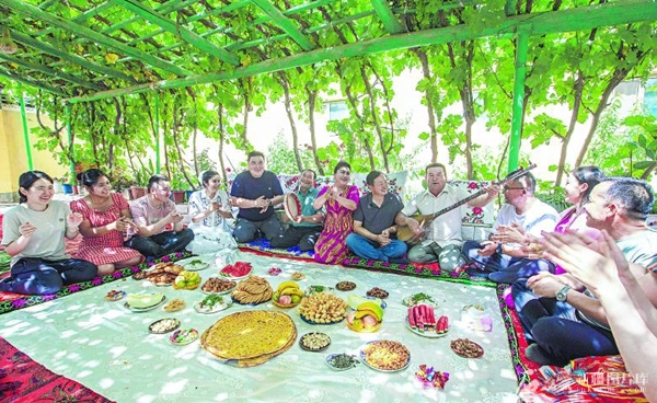 6月6日,中国石油昆仑物流有限公司塔里木运输分公司驻库车市塔里木镇羊场村工作队队员和各族群众齐聚一堂,品美食、话团结,共度古尔邦节。 袁欢欢摄
