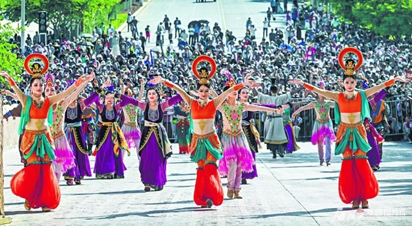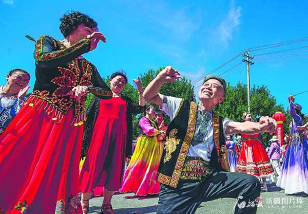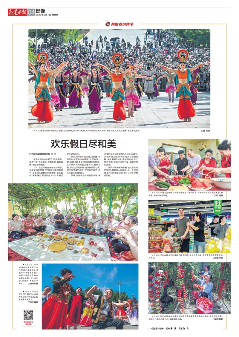 6月6日,在乌苏市甘河子镇广场,各族群众身着节日盛装,载歌载舞共度节日。 李仁锡摄 节日,生活气息弥漫在每个角落。从橙黄油亮的馓子中飘散出来的是香气,更是欢乐假期的热辣滚烫;商场超市,熙来攘往,彰显的是人们对幸福美好生活的向往。 节日,尽享欢乐的时光。在新疆,欢乐的时刻怎能没有歌舞?人们欢聚一堂,欢歌共舞是最好的和谐和美图景;工作队队员和村民共度节日,畅谈交流,共话生活的点滴,交流彼此的心声。关怀与关爱的纽带,在密切交流中,将人们的心紧紧相连。 节日,流淌着悠然闲适的气息。平日里忙碌于城市喧嚣的人们走出城市,来到乡村,在田园间享受大自然的馈赠,感受采摘的快乐;走进博物馆,在文物古迹中,汲取文化的力量,触摸岁月的脉动。
