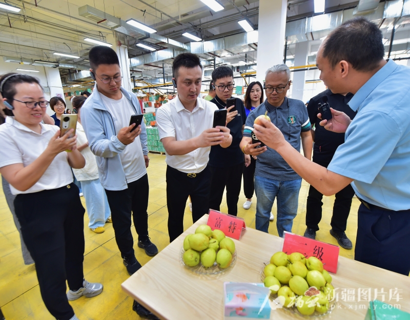 参会代表在观摩自动挑选生产线挑选出来的库尔勒香梨。 活动期间,参会代表还前往库尔勒市哈拉玉宫镇白杏采摘+直播销售现场、新疆恩农恒辉农业科技有限公司、库尔勒市电子商务双创孵化基地、“品味新疆”好产品巴州直播基地、新疆颐高数字经济产业园等地观摩。代表们品尝了库尔勒香梨、轮台白杏、纽扣蟠桃、樱桃苹果、油桃等巴州名优水果,对新疆水果的优良品质赞不绝口,纷纷表示新疆水果凭借独特的水土资源优势,在电商发展中具有巨大的潜力和广阔的市场前景。