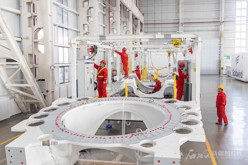 6月3日,塔城市金风风电设备有限公司生产车间内,工人正在抓紧生产。新疆塔城重点开发开放试验区管理委员会供图