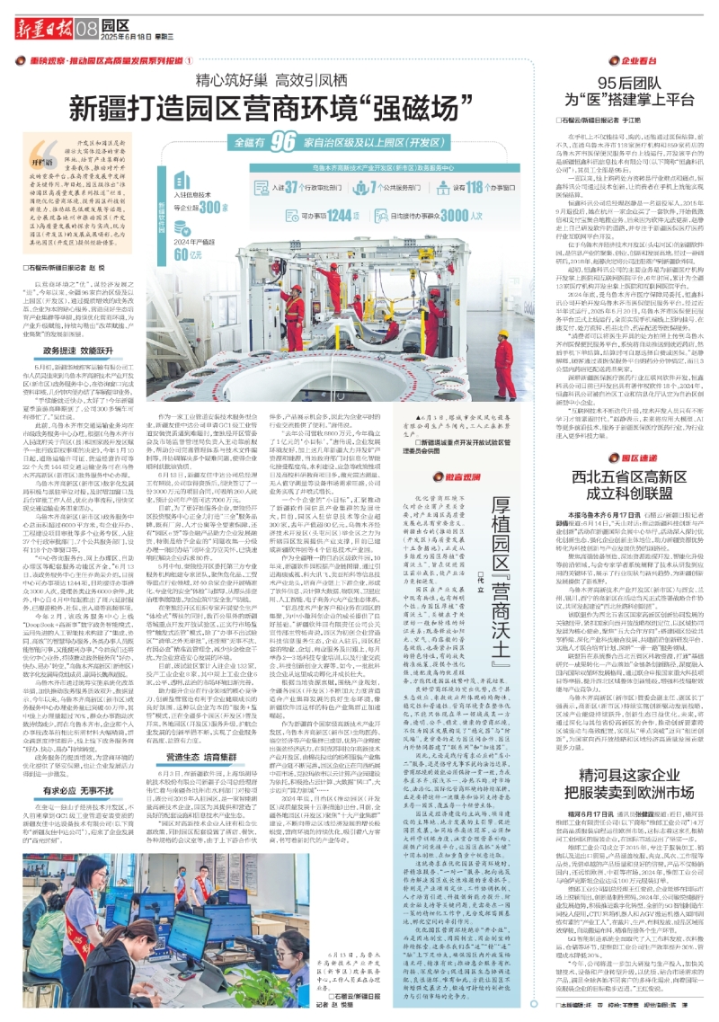 开发区和园区是新疆壮大实体经济的重要阵地、培育产业集群的重要载体、推动对外开放的重要平台,在高质量发展中发挥着关键作用。即日起,园区版推出“推动园区高质量发展系列报道”栏目,围绕优化营商环境、提升园区科技创新能力、推动绿色低碳发展等话题,充分展现各地州市推动园区(开发区)高质量发展的探索与实践,既为园区(开发区)的发展成果喝彩,也为其他园区(开发区)提供经验借鉴。