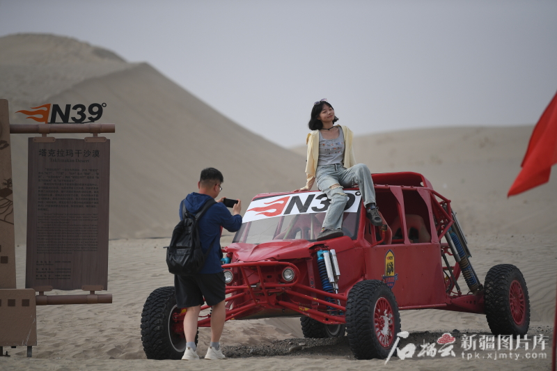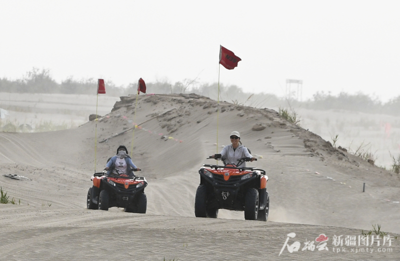 6月17日,游客在景区体验沙漠摩托。 石榴云/新疆日报讯(记者 汤永摄影报道)6月17日,麦盖提县塔克拉玛干N39°沙漠旅游景区内,越野车在沙丘间驰骋,游客在尽情体验沙漠冲浪的刺激。