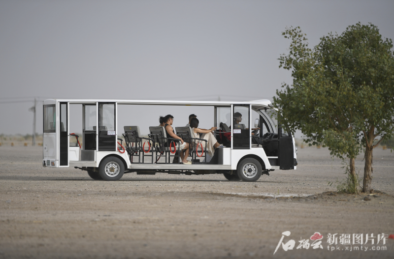 6月17日,游客在景区乘坐观光车游览。 麦盖提县通过科学治沙与旅游开发相结合,实现生态保护与经济发展双赢,探索出一条沙漠特色产业可持续发展之路。