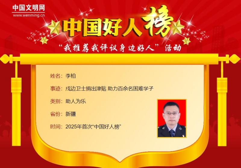 石榴云/新疆日报讯 6月24日,2025年首次“中国好人榜”发布仪式暨全国道德模范与身边好人现场交流活动在河南省安阳市红旗渠纪念馆举办。经各地推荐、网友评议和专家评审等环节,共有152人(组)助人为乐、见义勇为、诚实守信、敬业奉献、孝老爱亲身边好人光荣上榜。其中,新疆(含兵团)2人上榜,他们是捐出津贴,助力百余名困难学子的戍边卫士李柏和跳入冰冷渠水救出老人的退役军人张智勇。 李柏(助人为乐好人)