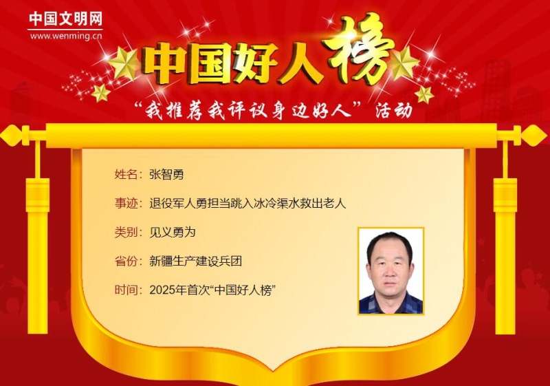 张智勇,男,1974年6月生,新疆生产建设兵团第十三师新星市红星一场居民,曾是一名军人。2024年7月7日早上,张智勇在店门口补胎时,听到“扑通”一声,察觉可能是有人落水,他立刻跑到红星渠边。只见一位老人在水中挣扎,水流湍急,情况危急。张智勇毫不犹豫地跳入冰冷的渠中,在好心人的帮助下,将老人成功救上岸,自己却因救人受伤。 张智勇救落水老人的事情发生后,人们纷纷为他的勇敢和担当点赞。对于这些赞誉,张智勇显得很谦虚。他说:“当时情况非常紧急,我觉得我只是做了我应该做的事情,我相信,任何一个有正义感的人在那种情况下都会做出同样的选择,而且我是一名退役军人,更应该义无反顾地救人。” 综合:新华社、中国文明网 【相关新闻】 中央精神文明建设办公室2025年首次发布“中国好人榜”