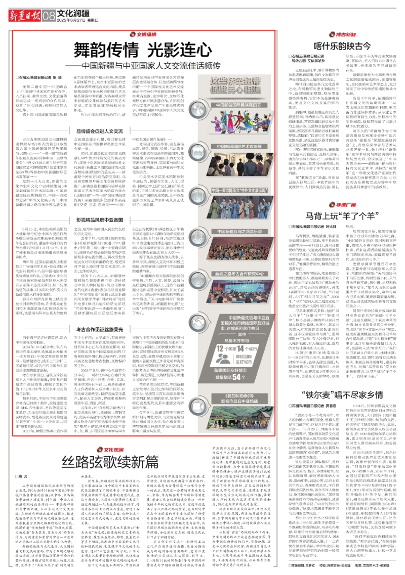 第三届中国新疆国际艺术双年展影像设计作品。石榴云/新疆日报记者 银璐摄 党的十八大以来,新疆的文化事业和文化产业持续繁荣,中国新疆国际艺术双年展、中国新疆国际民族舞蹈节、中国—亚欧博览会“中外文化展示周”、中国新疆丝绸之路音乐季等品牌文化交流盛会逐步扎根,吸引着包括中亚国家在内的世界各国艺术家会聚一堂。 同时,新疆文化艺术团体也携融汇中华优秀传统文化的精品力作,走进中亚各国或参加国际性文化展会:新疆艺术剧院创排的大型音舞诗画《掀起你的盖头来——新疆是个好地方》赴哈萨克斯坦、乌兹别克斯坦开展文化交流和旅游推广;新疆丝路书画院与哈萨克斯坦国立艺术学院美术馆联合举办《龙舞丝路“一带一路”国际书画交流展》;新疆画院多位画家作品亮相《交流 互鉴 向未来——中国·中亚五国油画作品展》…… 文明因交流而多彩,因互鉴而丰富。音乐、舞蹈、绘画、书法等多种艺术形式在交流中跨越国界、激情碰撞,而中国新疆以东西方文化交流枢纽的身份,实现着与国际文化前沿的共振,让世界看到中华文化的活力。 中央美术学院美术馆馆长张子康认为,新疆在历史、人文、民俗、民间艺术上因“交汇融合”形成的美,正通过多元品牌文化交流盛会与更广阔的天地关联,让中亚及更多国家的艺术家和观众真正认识了中国新疆。 影视精品风靡中亚各国 5月15日,中国驻哈萨克斯坦大使馆举行纪念中国人民抗日战争暨世界反法西斯战争胜利80周年电影招待会,重温中哈合拍的首部电影《音乐家》。6月13日,中央广播电视总台电影频道再次播出该影片。
