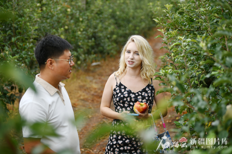 7月28日,采访团成员与阿克苏丰瑾现代农业发展有限公司苹果优质高效栽培示范基地工作人员交流。