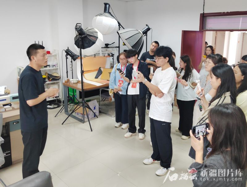 7月28日,采访团成员拍摄阿克苏市电商创业孵化基地采访电商代表。