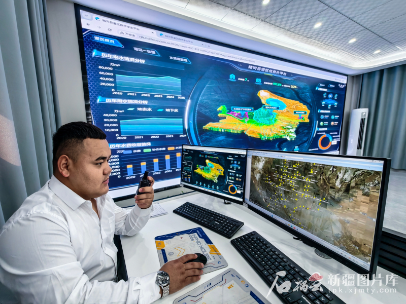 8月5日,精河县大河沿子镇九分闸信息化调度分中心,工作人员在监测农田灌溉情况。作为当地农业灌溉的“主力军”,大河沿子灌区覆盖周边25个村组、22万余亩耕地。