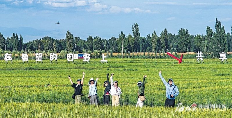 8月8日,游客在察布查尔锡伯自治县纳达齐牛录乡的稻田游览。该乡以传统农业为根基,以观光旅游为画笔,描绘一幅产业兴、乡村美、农民富的画卷。