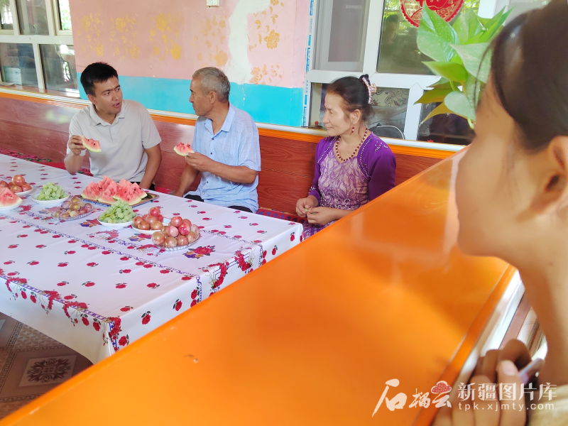 8月8日,伽师县居仁镇开旦木加依村党支部书记伊尔夏提·阿不来提(左一)在村民家中了解生活用水情况。伽师县城乡饮水安全工程通水以来,“甜”成为当地各族干部群众对水的共同感受。